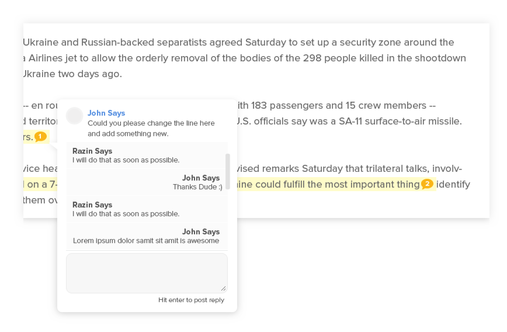 In this application, people work collaboratively. So, commenting feature is one of the important feature for text-editor. To make comment- select a word/sentence from the text-editor, hit the Comment menu from the sidebar or select the comment option by the mouse right button, write something and hit enter to make comment. The comment box is a fixed height scrollable box. So it can able to show the multiple comments at a time.