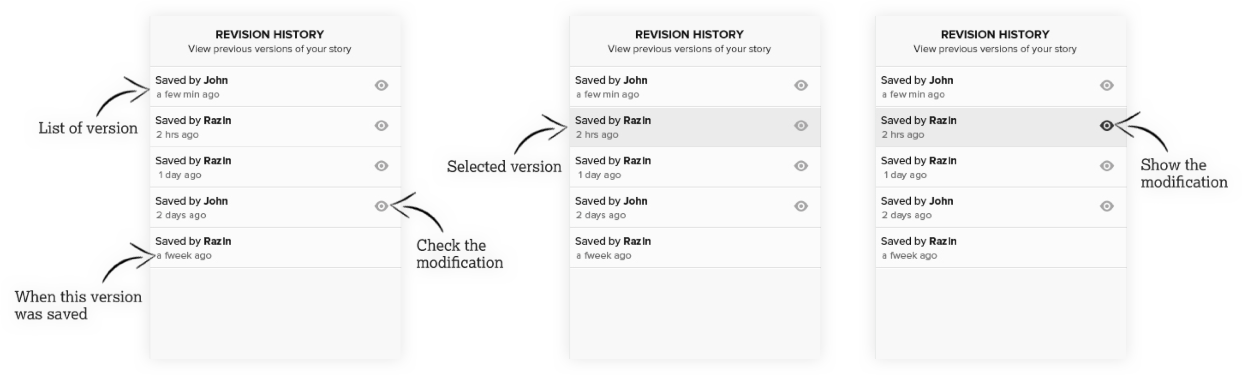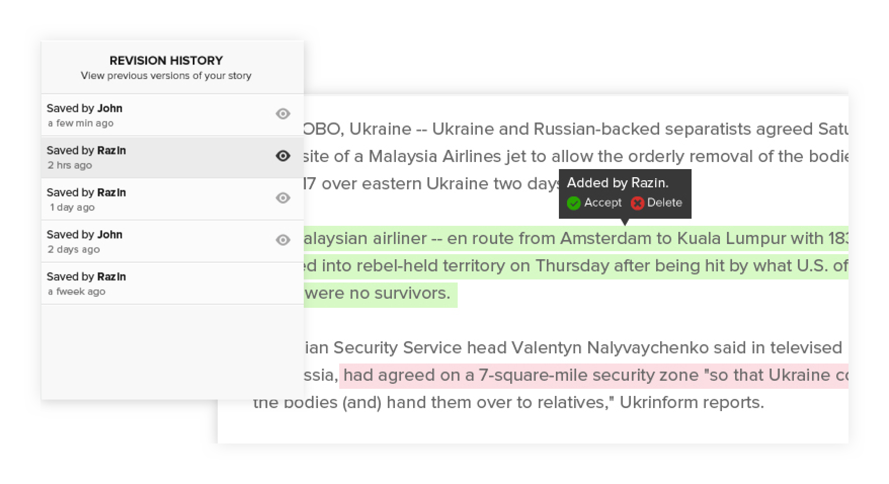 Select a version from the History panel. It will show the article. Click the eye icon and it will show the last changes (added by green or deleted by red) which have been made by the last user. Users can also add/delete new after accept pr cancel the previous changes. After modifying everything user will save it, and it will create a new version of the article.