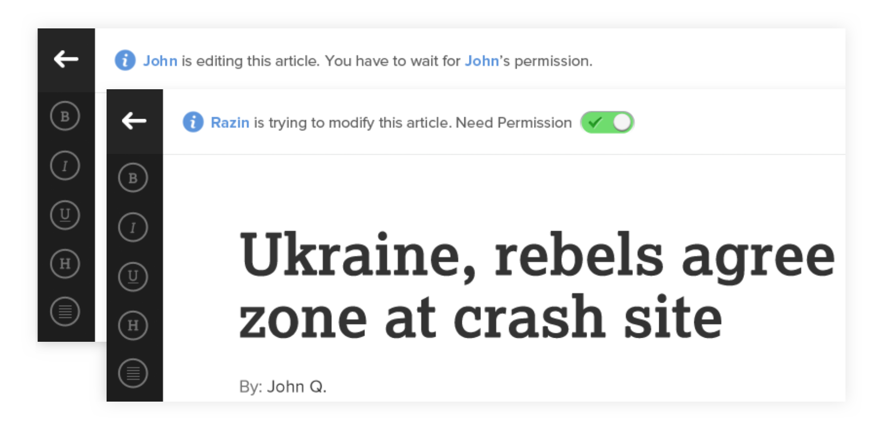 If two user wants to edit the same article at the same time, both user will get notification or alert to understand the situation. The second user needs approval from the first user to edit the article.