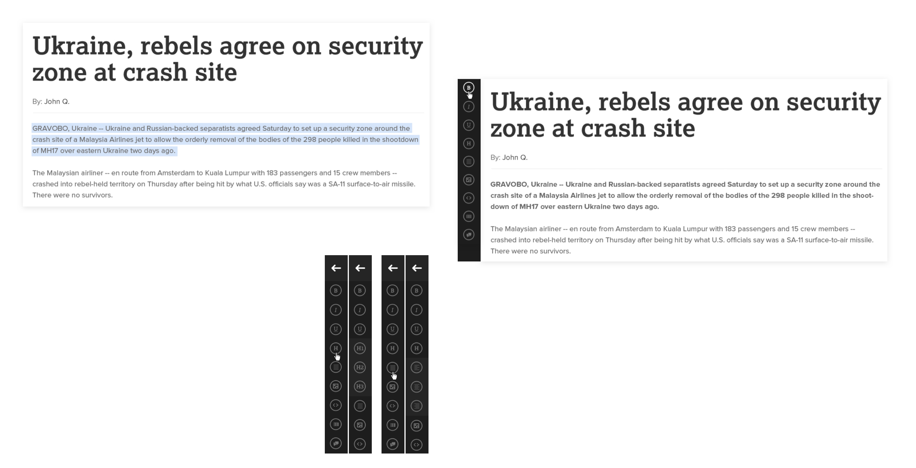 The design and element structure focused on what user does during and after writing. The things during writing like text-decoration, new element insert, table, code, comments are in the left panel. And the top bar is arranged by what people do after writing like: save, redo or undo, or check history.