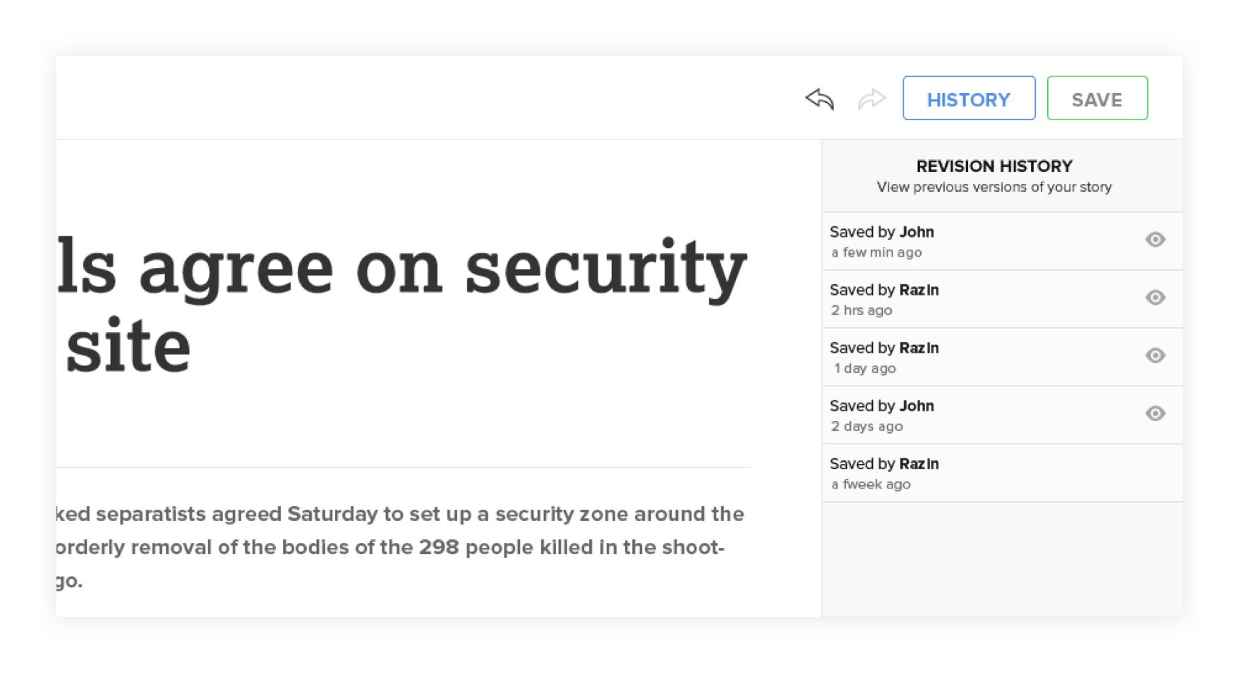 By History, user can see the versions of the article. It will show the recent modification of the current article. When anyone clicks on History button the panel will come from right side of the window. Again click on History button it will hide automatically. User can see all version but only modify the latest version of the history list.