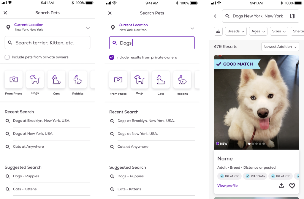 The PetFinder mobile app is a popular platform for pet adoption, but users were struggling to find the pets they were interested in due to the outdated and cluttered search screen. The goal of this project was to improve the user experience by redesigning the search screen to make it more user-friendly and intuitive. I worked on changing the search page which improved user interaction by 12%. The search page options and results were segmented in a way that helped users to scan through easily and more effectively.